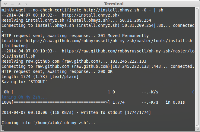 wget --no-check-certificate http://install.ohmyz.sh -O - | sh