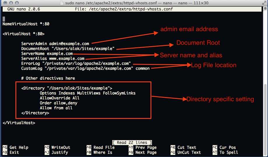 # Virtual Hosts # # Required modules: mod_log_config NameVirtualHost *:80 <VirtualHost *:80> ServerName example.com ServerAlias www.example.com DocumentRoot "/Users/alok/Sites/example" <directory "/Users/alok/Sites/example"> Options Indexes MultiViews FollowSymLinks AllowOverride All Order allow,deny Allow from all </Directory> ErrorLog "/private/var/log/apache2/dummy-host.example.com-error_log" CustomLog "/private/var/log/apache2/dummy-host.example.com-access_log" common </VirtualHost>