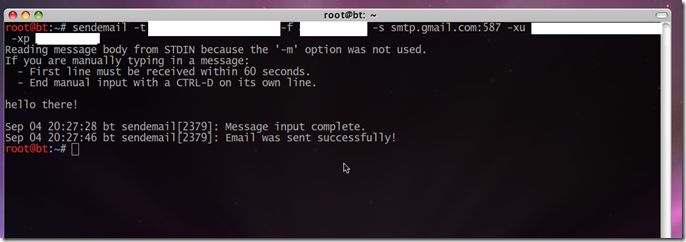 $ sendemail -t (destination address ) –f (from eg. foo@bar.com ) –s (server:port) –xu (smtp server username ) –xp (smtp password) –m (message)It will use gmail as smtp server to send your email