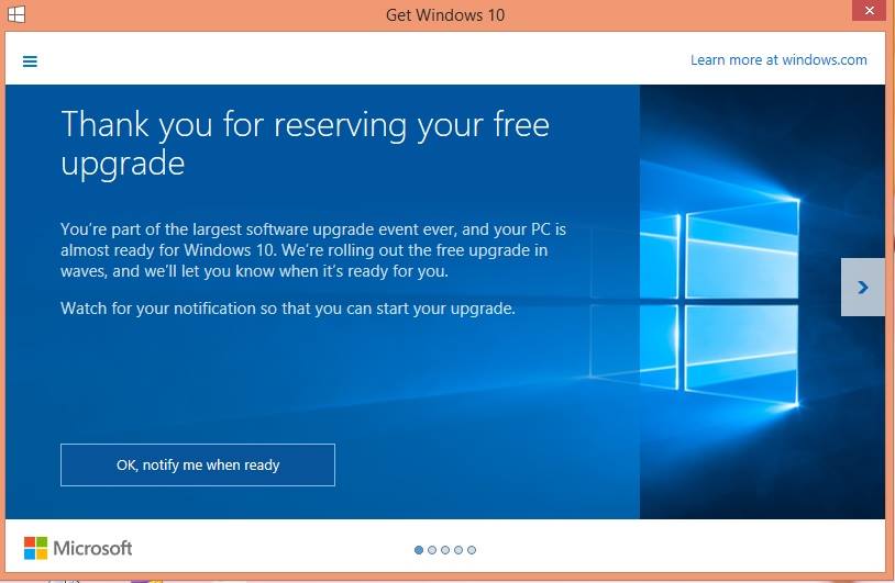 If you already , reserved your windows copy using “get windows 10 ” tools , then just wait for windows 10 update until it’s available for your computer .