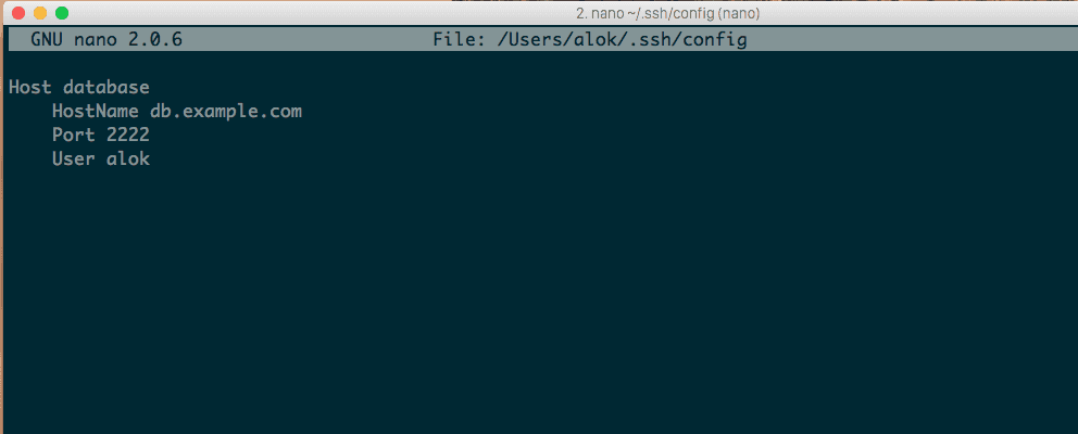 User alokafter this simple configuration you can connect to database server by just typing ssh database .