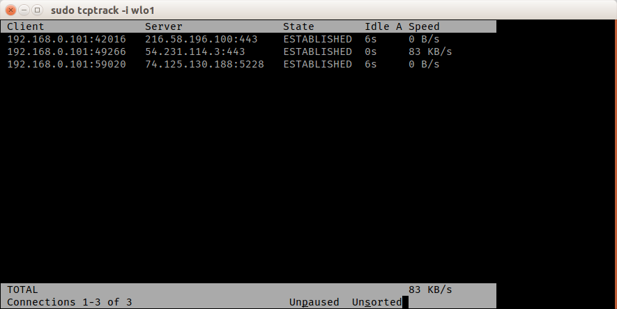 ” tcptrack displays the status of TCP connections that it sees on a given network inter‐